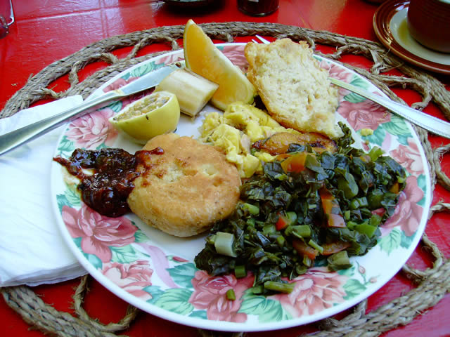 その他トマト、タマネギ 、スコッチボネットとを油で蒸して味付けされ塩魚などと一緒に出される。